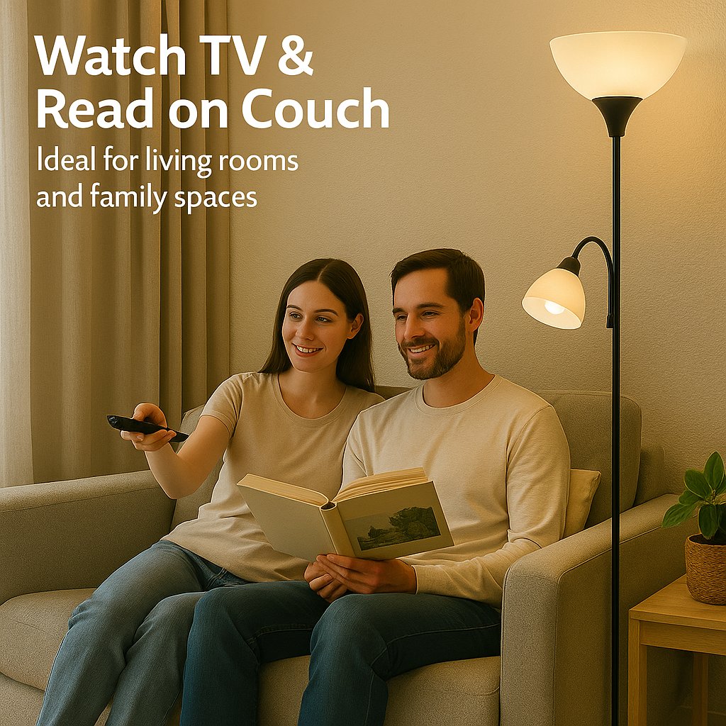 Brighten any space with this modern 72” torchiere floor lamp. The white-frosted shade provides soft ambient light, while the adjustable side lamp delivers focused task lighting—perfect for living rooms, bedrooms, dorms, or offices. A sturdy base adds stability, and the shatter-resistant plastic shade is safer than glass. The main light works with a 3-way bulb for customizable brightness (bulbs not included). Quick, easy assembly makes this slim standing lamp an ideal choice for small to medium rooms.